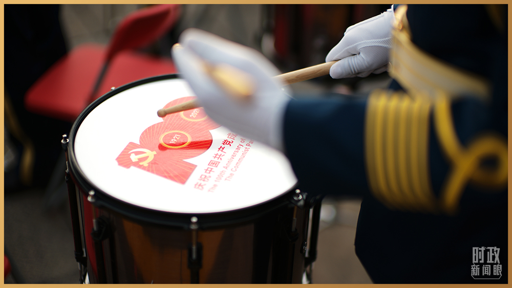 △ 鼓面上帶有建黨百年慶?;顒訕俗R(總臺央視記者彭漢明拍攝)