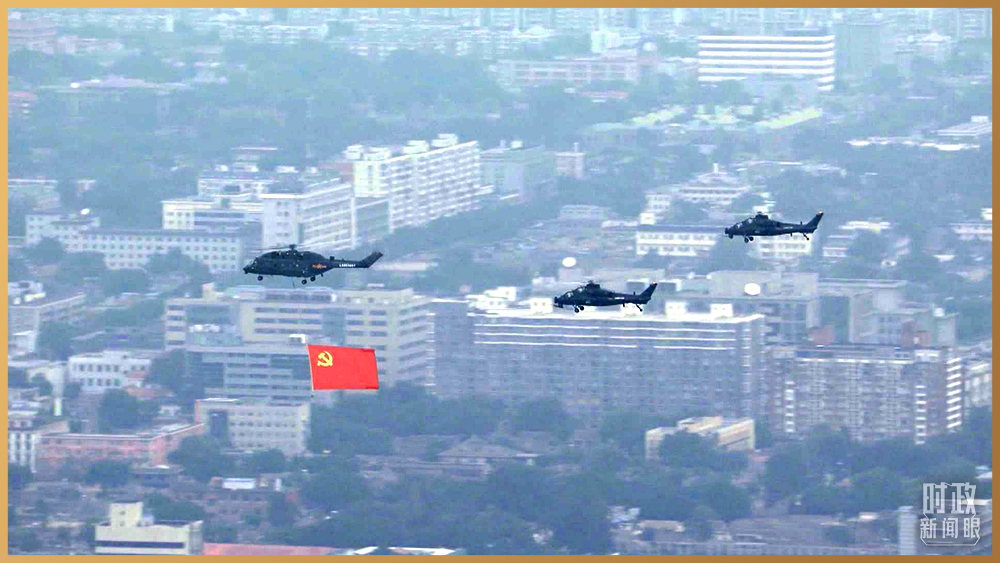 △直升機懸掛鮮紅的中國共產黨黨旗飛過。