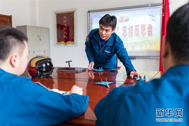 空軍航空兵某旅副參謀長姚凱(中)在大隊講評室給年輕飛行員講述對抗空戰(zhàn)比武中的經(jīng)驗(yàn)教訓(xùn)(2018年9月14日攝)。新華社發(fā)(張皓陽 攝)