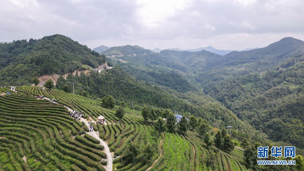 游客在位于陜西省安康市平利縣老縣鎮(zhèn)蔣家坪村的女媧鳳凰茶業(yè)現(xiàn)代示范園區(qū)參觀游玩(2021年7月24日攝,無人機照片)。 新華社記者 徐欽 攝