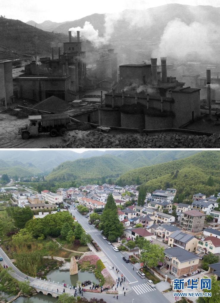 拼版照片:上圖為浙江省湖州市安吉縣天荒坪鎮(zhèn)余村二十世紀(jì)八十年代的資料照片;下圖為2018年4月24日,游客在整修一新的余村游覽(新華社記者翁忻旸攝)。 新華社發(fā)