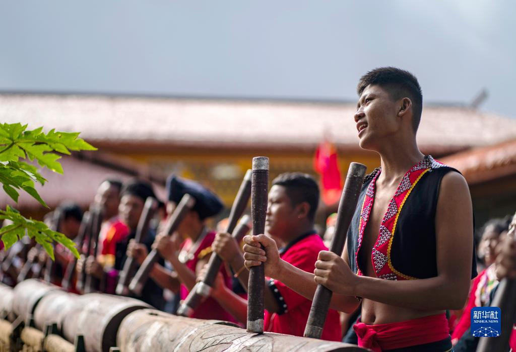 云南省滄源佤族自治縣班洪鄉(xiāng)班洪村的佤族群眾身穿節(jié)日盛裝,敲響佤族木鼓(8月20日攝)。新華社記者 江文耀 攝