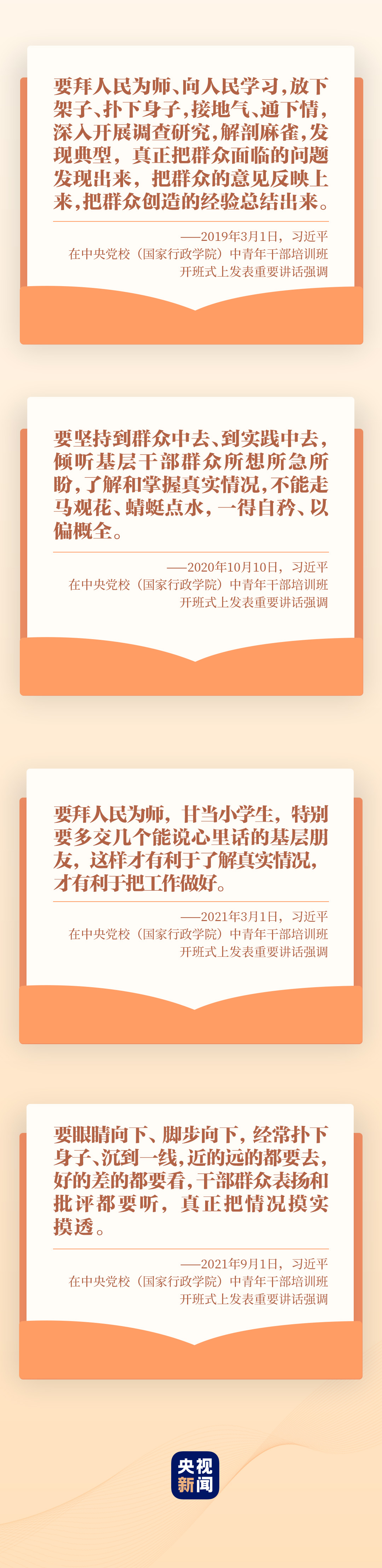 “堅(jiān)持從群眾中來(lái)、到群眾中去,真正成為群眾的貼心人” “既要‘身入’基層,更要‘心到’基層”“掌握調(diào)查研究這個(gè)基本功”……2019年以來(lái),習(xí)近平總書記在中青年干部培訓(xùn)班開(kāi)班式上多次要求干部拜人民為師,深入基層開(kāi)展調(diào)查研究。