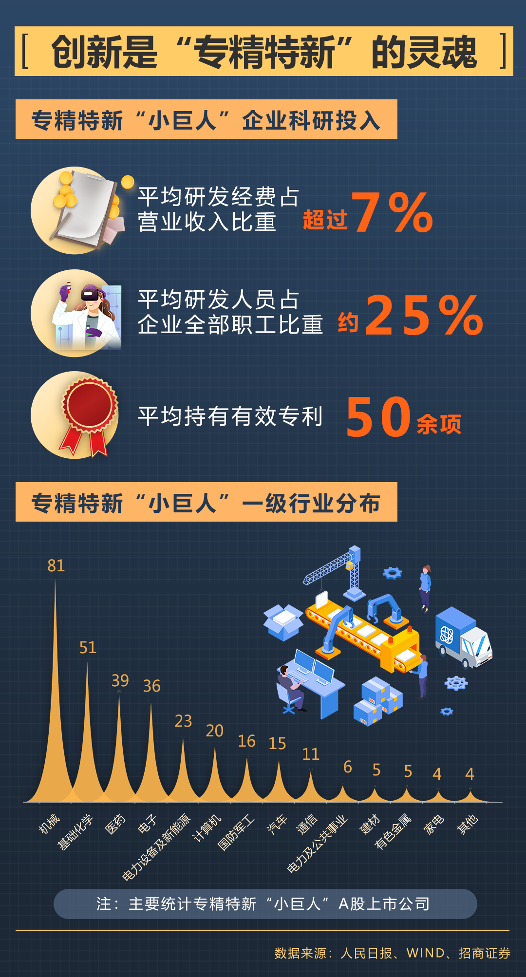 “小巨人”企業(yè)在多個(gè)關(guān)鍵領(lǐng)域?yàn)辇堫^骨干企業(yè)配套,也在細(xì)分領(lǐng)域持續(xù)創(chuàng)新并占據(jù)市場領(lǐng)先地位。這些企業(yè)注重制造業(yè)細(xì)分領(lǐng)域的創(chuàng)新,在上天、入海、探月、高鐵等大國工程中,都能找到“小巨人”企業(yè)的產(chǎn)品。根據(jù)招商證券統(tǒng)計(jì),A股上市的專精特新“小巨人”企業(yè)中,機(jī)械行業(yè)的占比最高,基礎(chǔ)化工、醫(yī)藥、電子等緊隨其后。