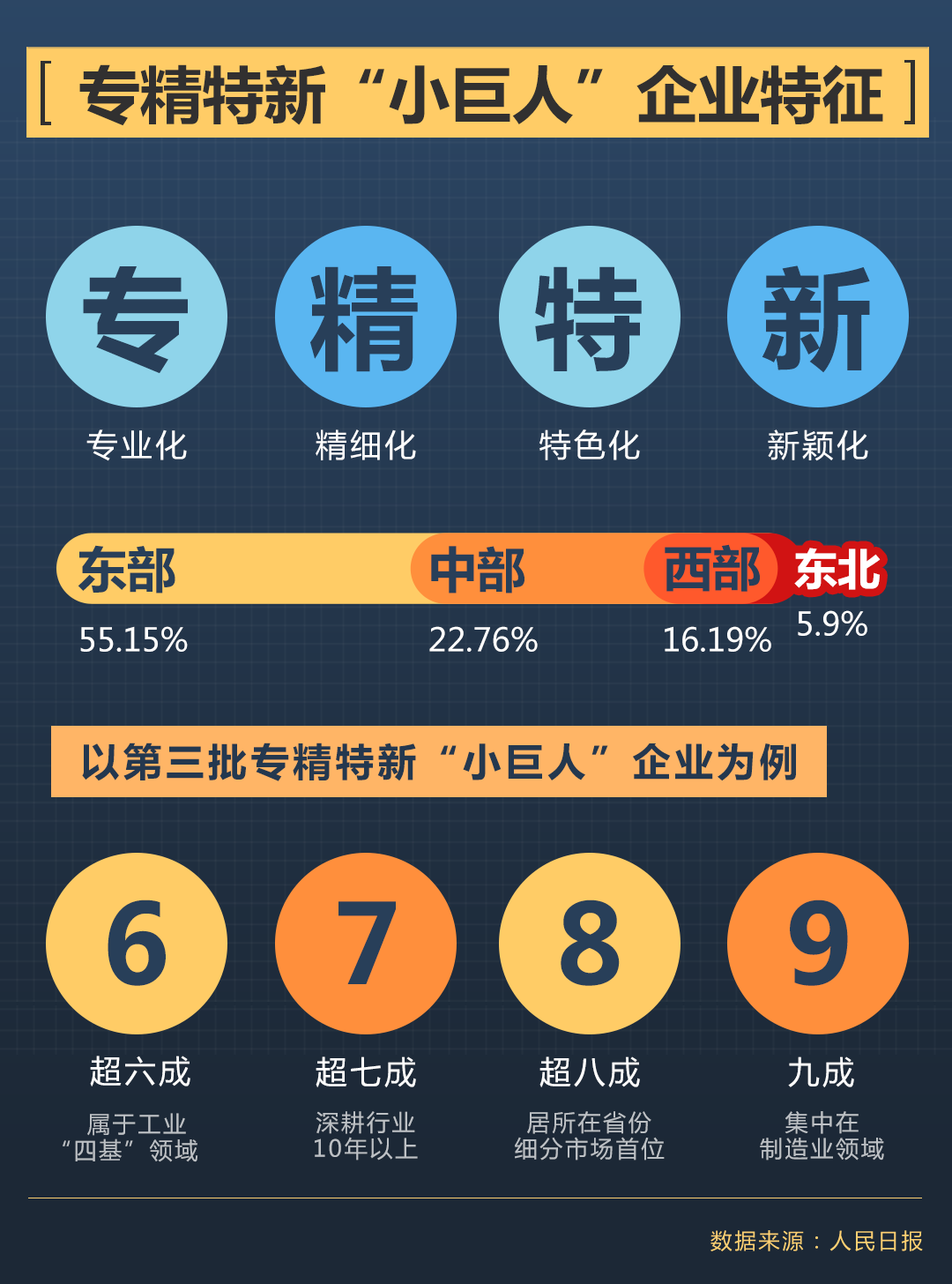 聚焦實(shí)業(yè),做精主業(yè)。第三批入選企業(yè)呈現(xiàn)出“6789”的特點(diǎn):超六成屬于核心基礎(chǔ)元器件、關(guān)鍵基礎(chǔ)材料、先進(jìn)基礎(chǔ)工藝、產(chǎn)業(yè)技術(shù)基礎(chǔ)領(lǐng)域,超七成深耕行業(yè)10年以上,超八成居所在省份細(xì)分市場首位,九成集中在制造業(yè)。