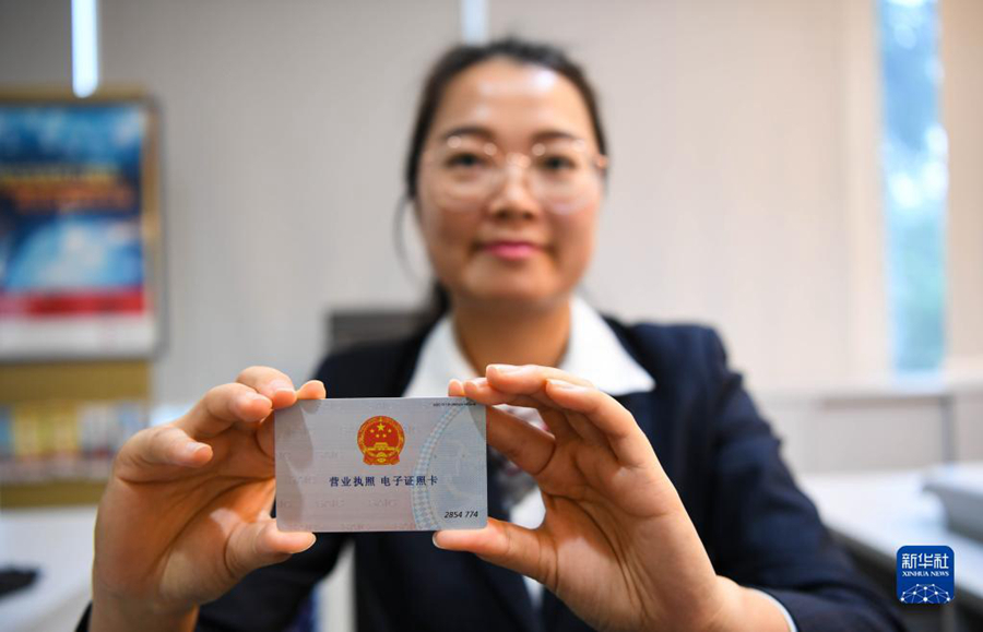 中國(guó)銀行橫琴分行工作人員展示商事主體電子證照銀行卡(2018年11月15日攝)。新華社記者鄧華攝