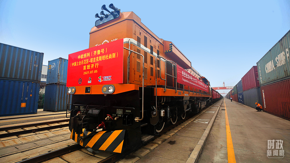 △2021年7月5日,中國青島,上合示范區(qū)前往塔吉克斯坦的首班中歐班列(齊魯號)發(fā)出。(圖/視覺中國)