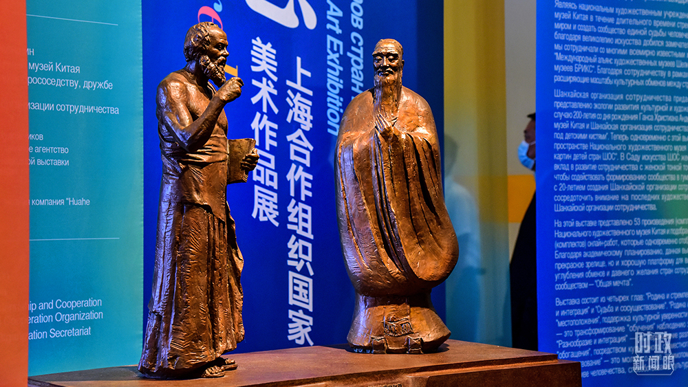 △2021年9月7日,“同一夢想——上海合作組織國家美術(shù)作品展”在北京開展。這是中國雕塑家吳為山的作品《神遇——孔子與蘇格拉底的對話》。(圖/視覺中國)