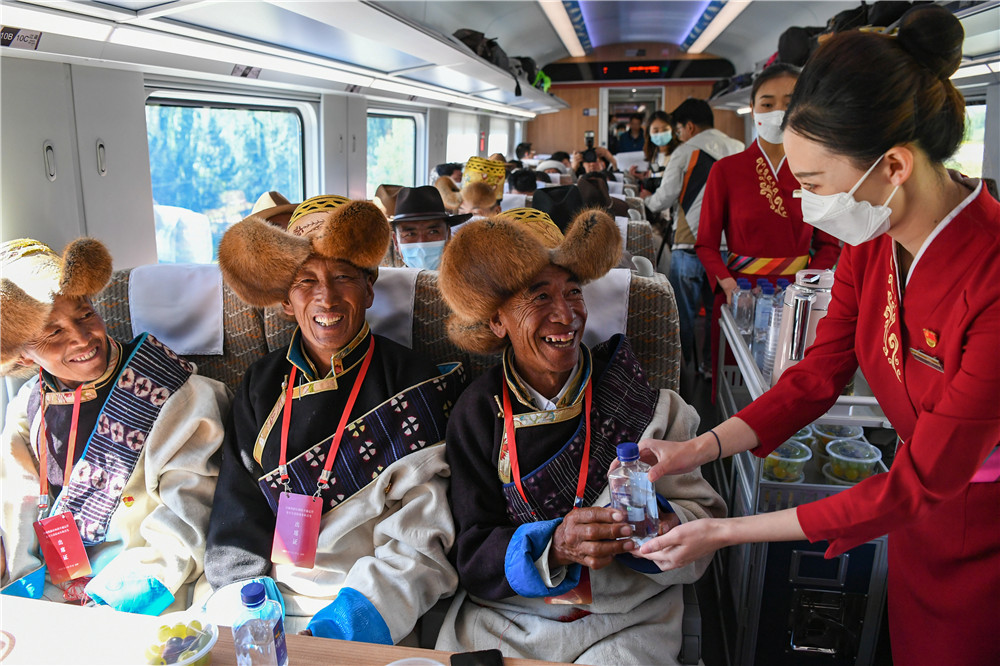6月25日,全長435公里、設(shè)計時速160公里的拉林鐵路建成通車,西藏首條電氣化鐵路建成,同時復(fù)興號實(shí)現(xiàn)對31個省區(qū)市全覆蓋。這是列車員向乘坐首趟復(fù)興號高原內(nèi)電雙源動車組的乘客遞水。新華社記者 普布扎西 攝