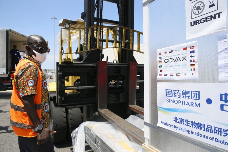 △工作人員在科特迪瓦阿比讓國(guó)際機(jī)場(chǎng)轉(zhuǎn)運(yùn)中國(guó)國(guó)藥集團(tuán)通過“新冠疫苗實(shí)施計(jì)劃”供應(yīng)的新冠疫苗(2021年9月18日攝)。