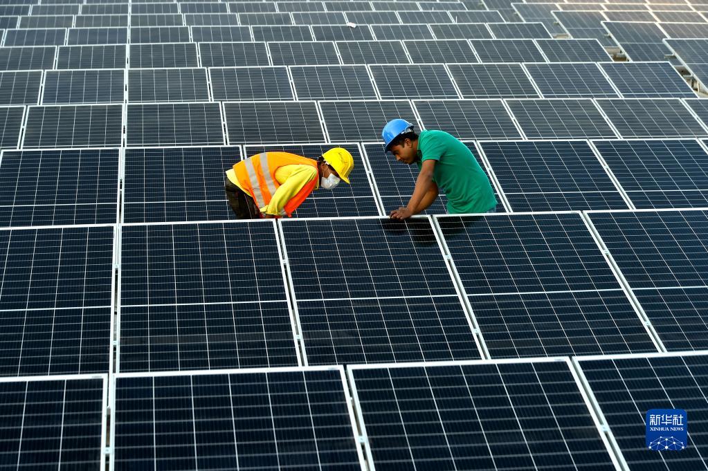 2021年1月3日,在位于孟加拉國首都達(dá)卡郊區(qū)的利德成集團(tuán)廠區(qū),工人們在房頂組裝光伏模組。從2020年開始,中資制衣類企業(yè)——利德成集團(tuán)在其位于孟加拉國達(dá)卡的廠區(qū)內(nèi)建設(shè)光伏電站,以降低對傳統(tǒng)能源的依賴,減少碳排放,從綠色發(fā)展的角度助力“一帶一路”建設(shè)。新華社發(fā)