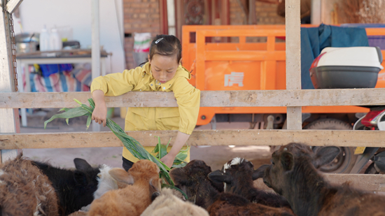 “妞妞合唱團(tuán)”的成員“粉妞妞”在家中給牛喂草。