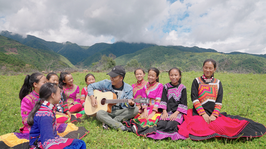 路面因?yàn)閯倓傁逻^的雨水變得有些泥濘,走了約半小時(shí)的山路后,鄉(xiāng)村教師吉布小龍帶著合唱團(tuán)的“妞妞們”坐在山頂草坪上。他用吉他伴奏,9個(gè)女孩圍著他放聲歌唱:“不懼密林深處的豺狼,敢于深海淺灘與蛇蝎作伴……”不遠(yuǎn)處的青山峰巒起伏,山頂上云霧徜徉。