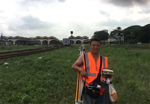 在中鐵一局三公司孟加拉帕德瑪大橋鐵路連接線項目,唐飛帶隊進(jìn)行前期控制網(wǎng)復(fù)測,因前期各項準(zhǔn)備工作還未到位,來到這個陌生的國度,唐飛面臨的是一個語言不通、無后勤保障、自然條件惡劣的環(huán)境。沒有翻譯,唐飛就用翻譯軟件翻譯生僻的英語和設(shè)計、監(jiān)理溝通;沒有合適的工人,唐飛和隊員們就自己挖坑、抬樁子;沒有食堂,他們連續(xù)吃了一個月的方便面午餐。孟加拉位于熱帶地區(qū),雨水多且來勢迅猛,雨來時,唐飛他們就在雨中堅持放線,雨太大實在無法觀測時,他們就站在雨中打著傘,用塑料袋保護(hù)著儀器,直到雨停后繼續(xù)觀測。