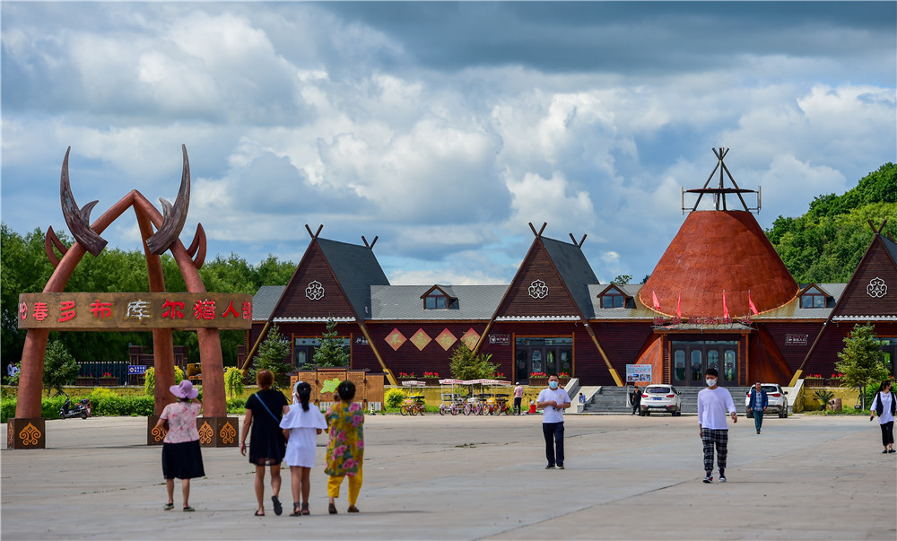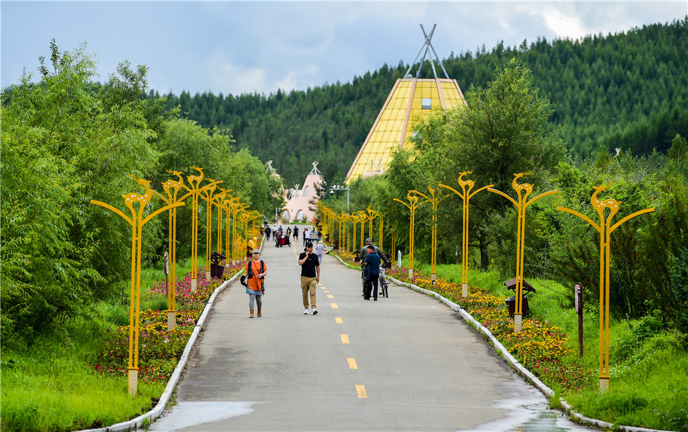8月6日,在鄂倫春自治旗大楊樹鎮(zhèn)多布庫爾獵民村,游人們在景區(qū)觀光。新華社記者 連振 攝