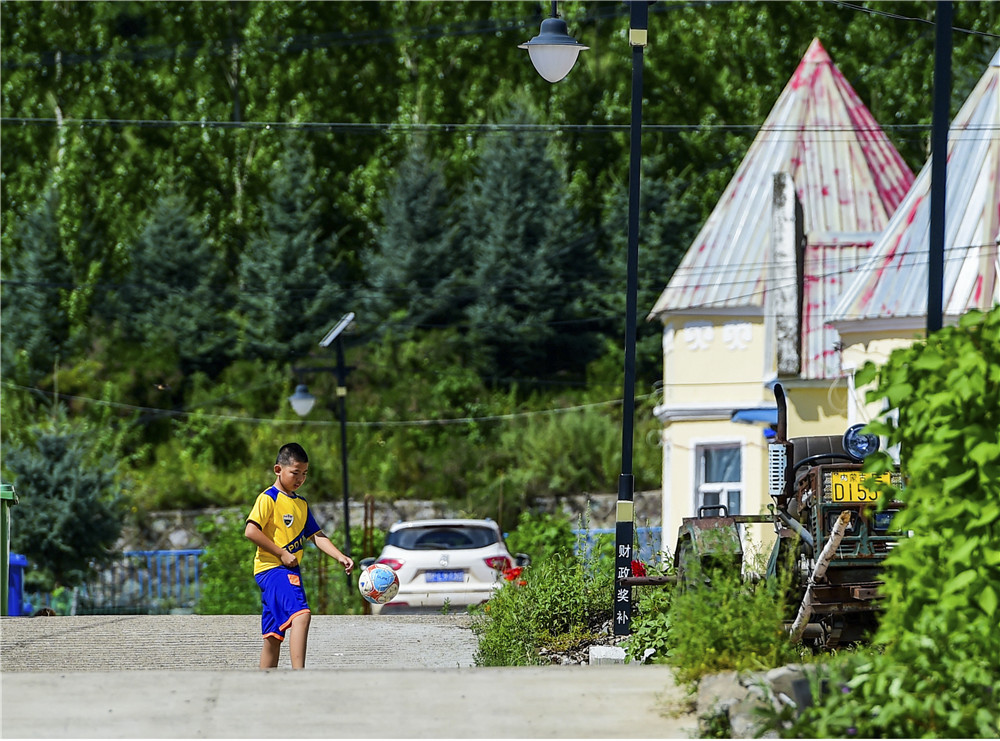 8月6日,在鄂倫春自治旗大楊樹鎮(zhèn)多布庫爾獵民村,一名男孩在村里踢足球。新華社記者 連振 攝
