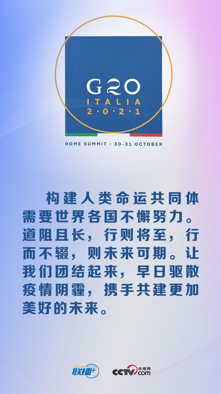 習(xí)主席強(qiáng)調(diào),面對(duì)世界百年未有之大變局和世紀(jì)疫情,二十國(guó)集團(tuán)作為國(guó)際經(jīng)濟(jì)合作主要論壇,要負(fù)起應(yīng)有責(zé)任,為了人類未來、人民福祉,堅(jiān)持開放包容、合作共贏,踐行真正的多邊主義,推動(dòng)構(gòu)建人類命運(yùn)共同體。