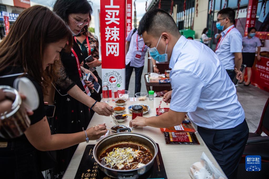 人們?cè)谧窳x市新蒲新區(qū)中國(guó)辣椒城品嘗辣椒醬(2020年8月18日攝)。新華社記者 陶亮 攝