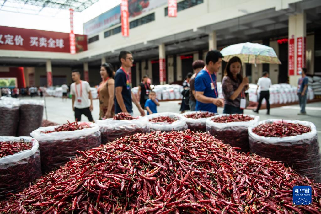 經(jīng)銷商在遵義市新蒲新區(qū)中國(guó)辣椒城挑選辣椒(2020年8月18日攝)。新華社記者 陶亮 攝