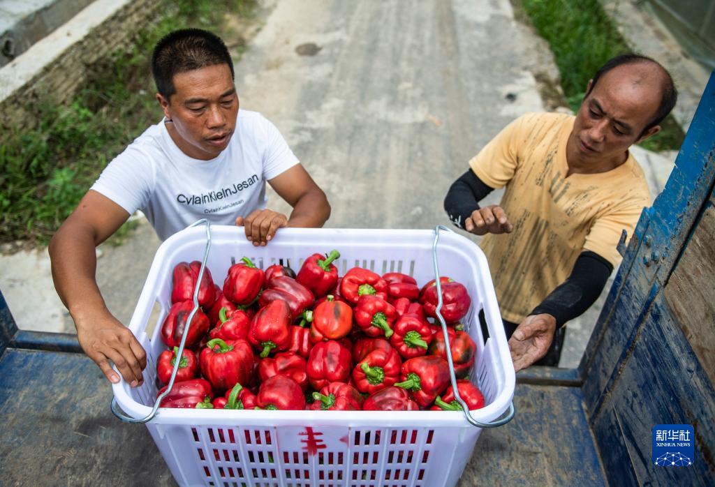 村民在貴陽(yáng)農(nóng)投集團(tuán)龍崗蔬菜基地將采收好的柿子椒裝箱(7月28日攝)。新華社記者 陶亮 攝