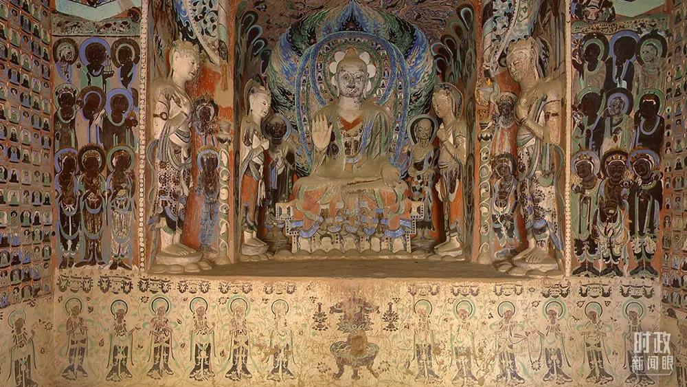 △敦煌莫高窟第420窟,創(chuàng)建于隋,南、西、北壁各開一龕,被稱為“三龕窟”。敦煌文化被認(rèn)為集建筑藝術(shù)、彩塑藝術(shù)、壁畫藝術(shù)、佛教文化于一身。(資料圖)