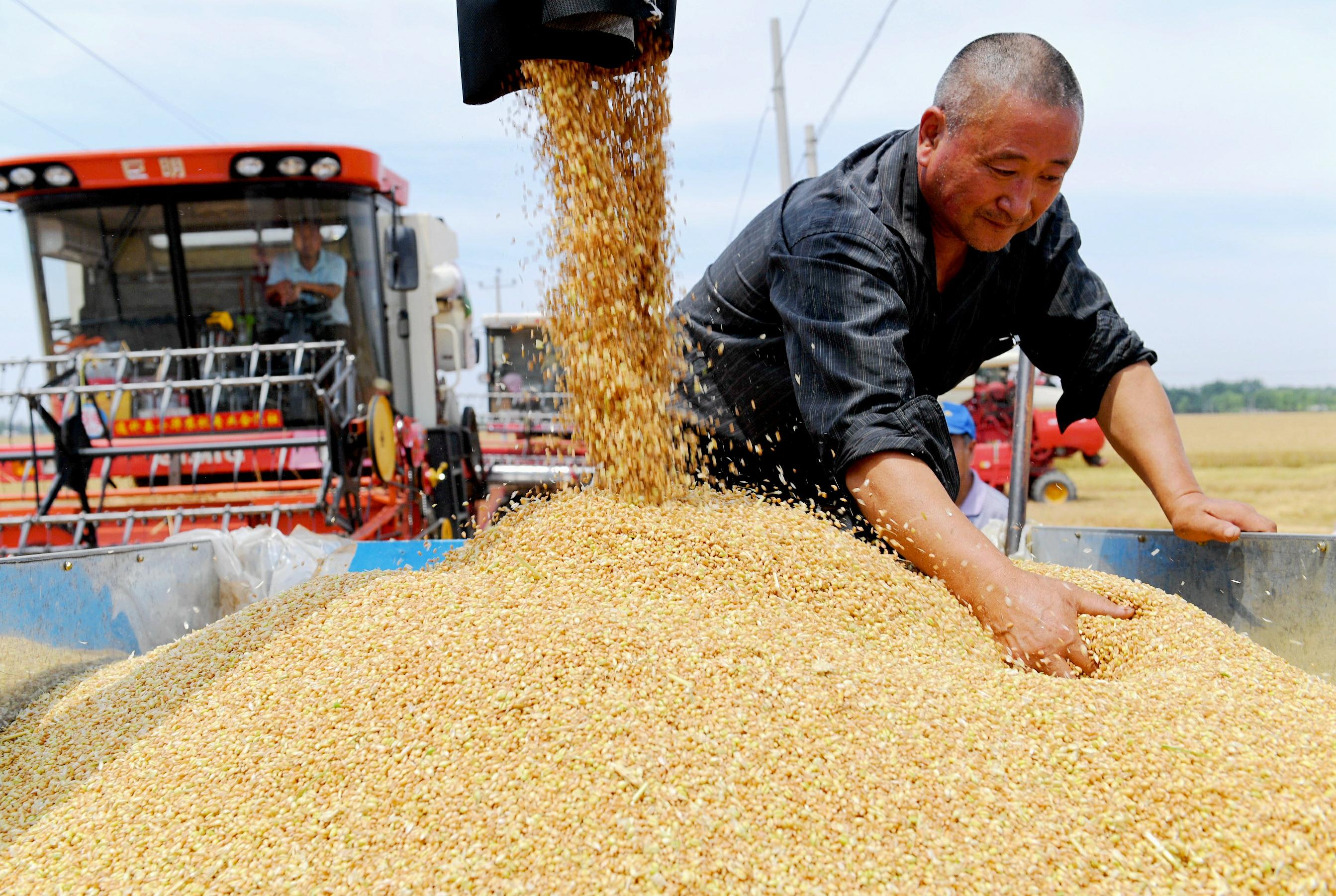 河北省衡水市阜城縣崔家廟鎮(zhèn)前磚門村的農(nóng)民在麥田收獲小麥(6月13日攝)。新華社記者 朱旭東 攝