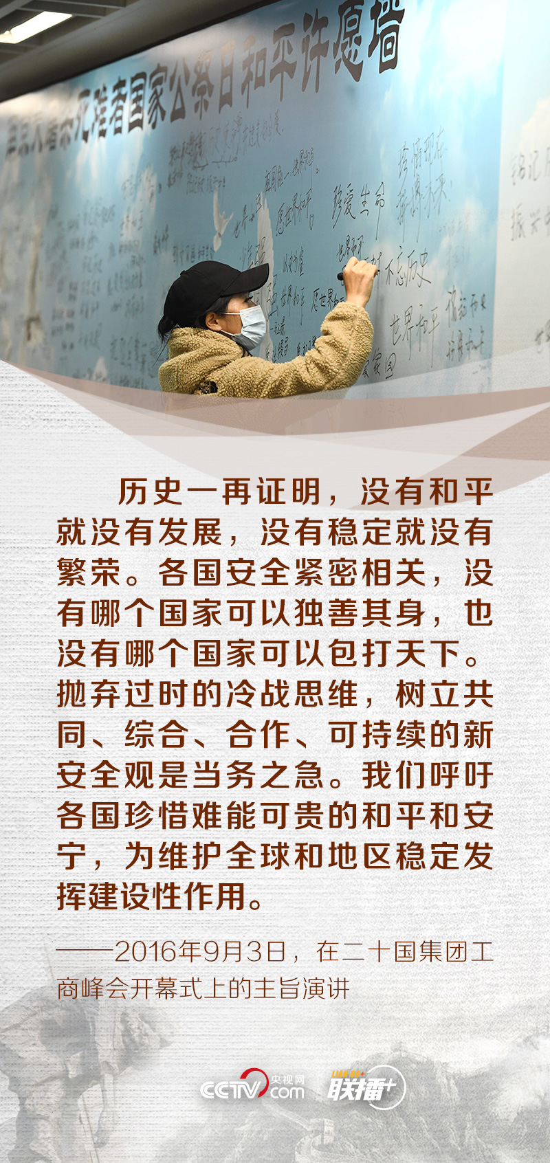 昭昭前事,惕惕后人;永矢弗諼,祈愿和平。在第八個(gè)南京大屠殺死難者國(guó)家公祭日來(lái)臨之際,央視網(wǎng)《聯(lián)播+》特梳理黨的十八大以來(lái)總書記關(guān)于銘記歷史、珍愛和平的重要論述,與您一同緬懷逝者,堅(jiān)定維護(hù)和平的決心。
