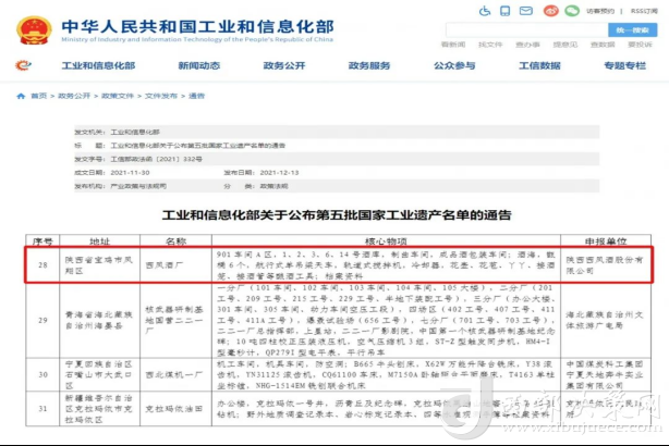 西部決策網(wǎng)訊(韓宗憲)12月13日,工業(yè)和信息化部公布了第五批國家工業(yè)遺產(chǎn)名單,西鳳酒釀酒工業(yè)遺產(chǎn)群作為唯一的中國白酒生產(chǎn)釀造項目同全國其他30家工業(yè)遺產(chǎn)一起進入名單。這也是繼6月10日國家級非物質(zhì)文化遺產(chǎn)榜單發(fā)布以來,西鳳榮列的又一重磅國家級名單。既標志了相關(guān)部門和廣大消費者對三千年無斷代西鳳酒釀造設(shè)備和釀造技藝的肯定,也表示出西鳳酒為中國白酒發(fā)展作出的突出貢獻。