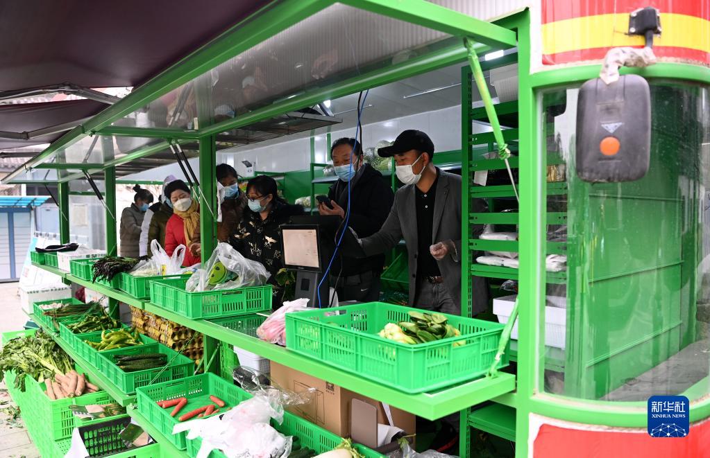 12月23日,西安市曲江新區(qū)一小區(qū)引入蔬菜大棚車(chē),住戶(hù)在小區(qū)內(nèi)買(mǎi)菜。新華社記者 劉瀟 攝