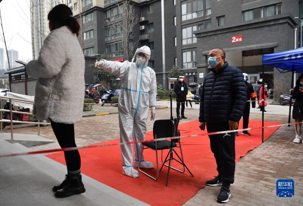 12月27日,在西安市雁塔區(qū)孟村小區(qū),盧晨陽(左二)引導(dǎo)居民進(jìn)行核酸檢測。新華社記者 張博文 攝