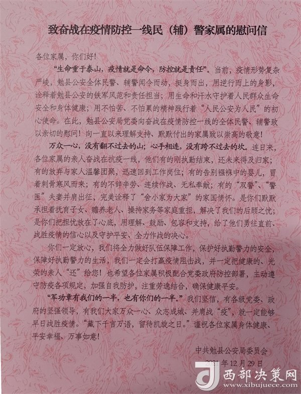 西部決策網訊為表達對奮戰(zhàn)在疫情防控一線民輔警家屬的崇高敬意,感謝他們對公安工作的理解和支持,12月29日下午,勉縣公安局組織開展疫情防控一線民輔警家屬慰問活動,為家屬們送去慰問信和慰問品,并通過他們向奮戰(zhàn)在一線的民輔警傳遞勉縣公安局黨委的溫暖和關愛,以更加飽滿的熱情、昂揚的斗志投入到疫情防控工作中。