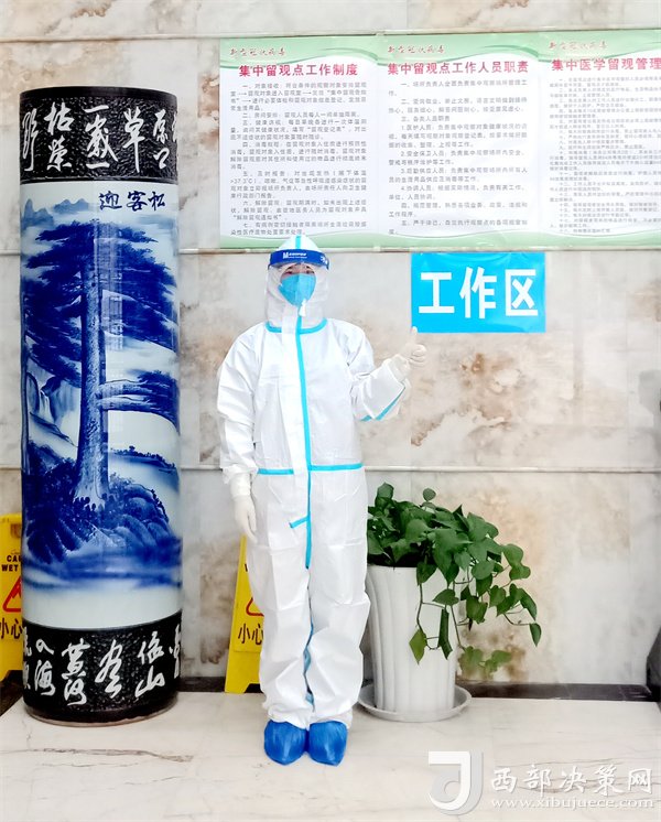 每天,她和隊(duì)員們穿著防護(hù)服24小時(shí)為隔離群眾掃碼、檢測體溫、遞送三餐、詢問留觀人員狀況、規(guī)范醫(yī)療廢棄物處置。夜深人靜時(shí),在賓館大廳和走廊間,時(shí)??梢钥匆娝β刀謭?jiān)定的背影。
