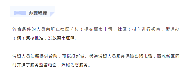符合條件的人員向所在社區(qū)(村)提交離市申請,社區(qū)(村)進行初審,街道辦(鎮(zhèn))復核批準,發(fā)放離市證明。