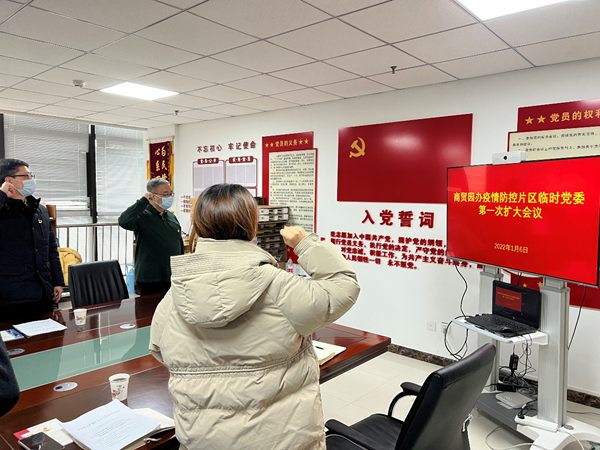 2022年1月6日,商貿(mào)園辦疫情防控片區(qū)臨時(shí)黨委在第一次擴(kuò)大會(huì)議上重溫入黨誓詞。浐灞融媒體中心供圖