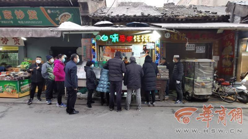 相對(duì)于回民街僅有兩三家店開(kāi)門(mén),而在周邊的大皮院、廟后街上就是另一番景象。多家餐飲店、美食攤不僅復(fù)工營(yíng)業(yè)甚至門(mén)前還排起了長(zhǎng)隊(duì)。“在家里憋了太久,就饞這一口牛肉泡饃。今天允許大家出門(mén)購(gòu)物了么,就趕飯點(diǎn)前來(lái)這大飽口福。”在一家泡饃店門(mén)前正排隊(duì)的顧客。雖然暫時(shí)還不允許堂食,但仍不能阻擋人們對(duì)美食的向往,紛紛拎著打包好的美食帶走。