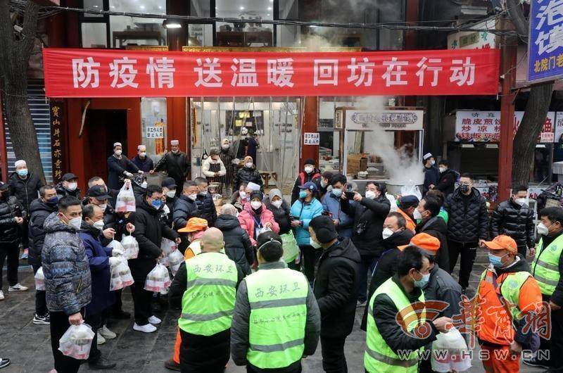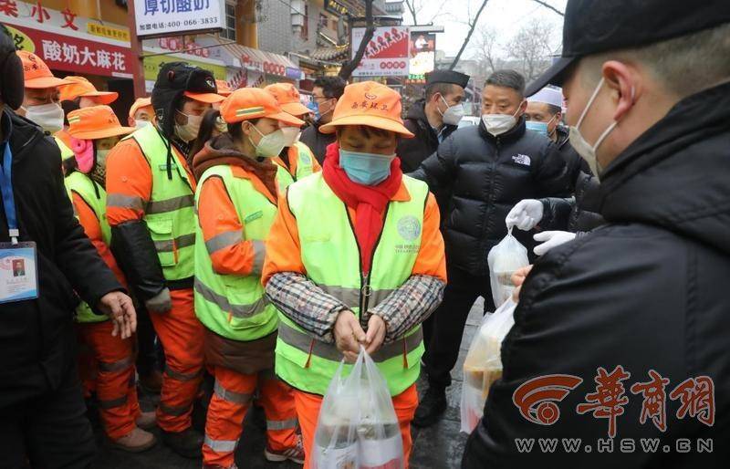 在回民街回坊老孫家泡饃店,服務(wù)員正在給周邊環(huán)衛(wèi)工免費(fèi)提供午飯。“自疫情嚴(yán)控以來(lái),我們每天為周邊參加一線(xiàn)防疫工作者近千份清真熟食,以感謝他們對(duì)西安市防疫做出的貢獻(xiàn)。”該店負(fù)責(zé)人說(shuō)。