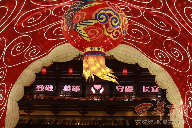 在雁南一路口設(shè)置了“致敬英雄 守望長(zhǎng)安”燈組。宋立嬌介紹,設(shè)計(jì)這組燈是為了向抗疫英雄致敬,并鼓舞全市人民抗疫士氣。雁南一路以南水池上“百鳥朝鳳”燈組,以鳳凰、牡丹、百鳥為主題,打造百鳥朝鳳氛圍裝置,體現(xiàn)出一切生機(jī)勃勃,美好時(shí)光來(lái)臨,看到了一片美好的前景。
