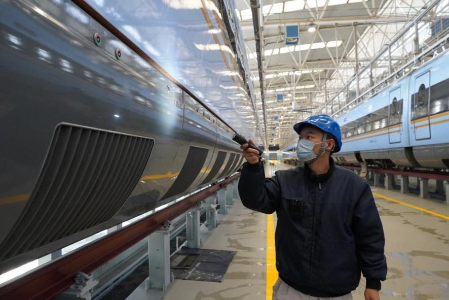 1月29日,在中國鐵路西安局集團(tuán)公司西安動車段檢修庫內(nèi),質(zhì)檢車間質(zhì)檢三組質(zhì)檢員龔奇正檢查著動車組走行部位,手中的可錄式手電一一掃過車輪、齒輪箱、閘片等配件,眼隨手動,緊盯著手電光照的地方,時不時伸手確認(rèn)配件安裝狀態(tài)。