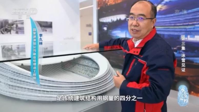 國家速滑館公司副總經(jīng)理、總工程師 李久林:通過張拉這個(gè)索,就像做網(wǎng)球拍一樣,只用了幾百噸的鋼絲就可以實(shí)現(xiàn)大型體育場館的屋頂,是傳統(tǒng)建筑結(jié)構(gòu)用鋼量的四分之一。