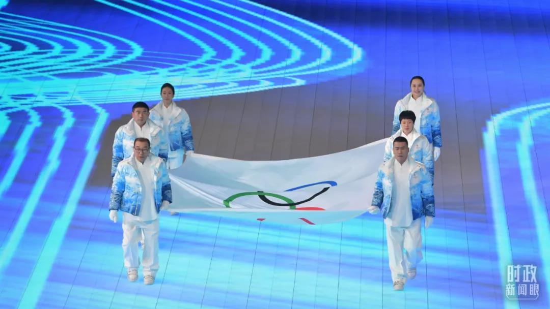 △北京冬奧會開幕式上,6名旗手手執(zhí)奧林匹克會旗入場。(總臺記者廖江衡拍攝)