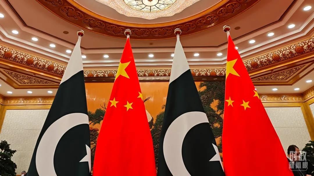 △會談現(xiàn)場擺放的巴基斯坦國旗和五星紅旗。(總臺央視記者楊立峰拍攝)