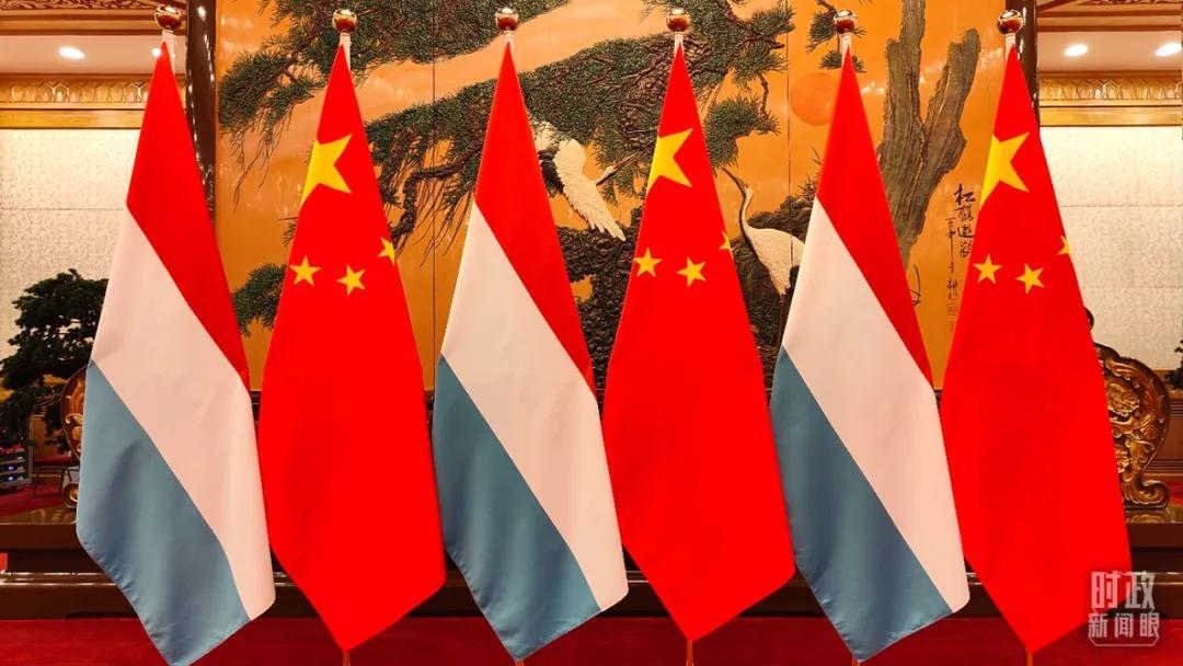 △會談現(xiàn)場擺放的盧森堡國旗和五星紅旗。(總臺央視記者楊立峰拍攝)