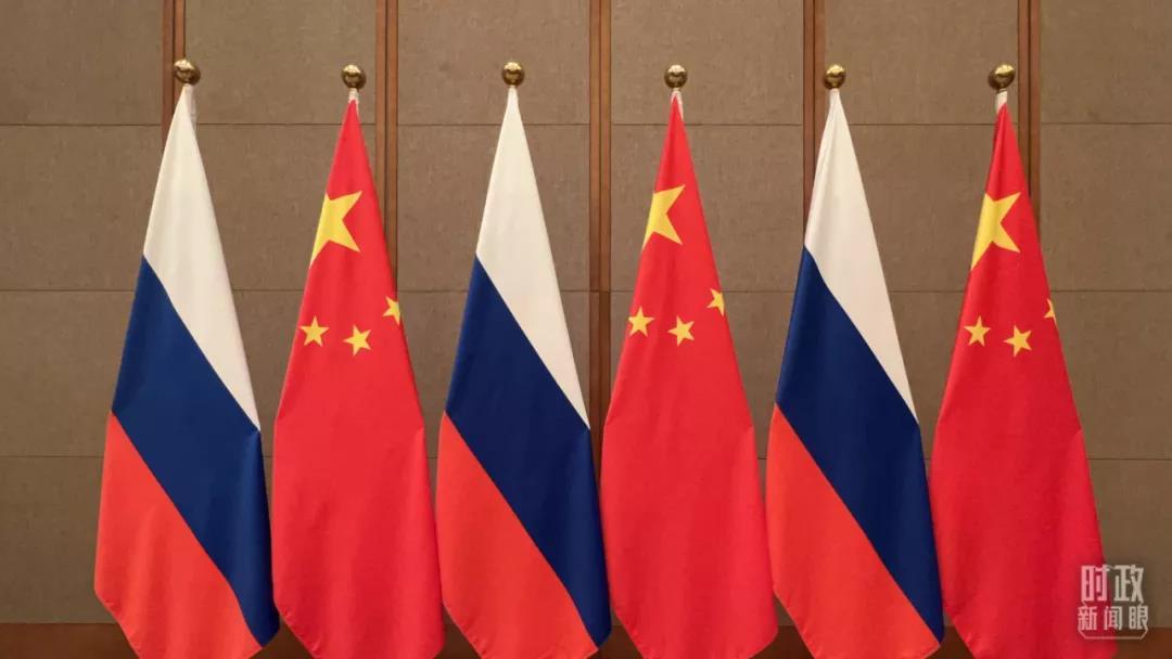 △2月4日,中俄兩國元首會談現(xiàn)場的兩國國旗。(總臺央視記者范學(xué)禹拍攝)