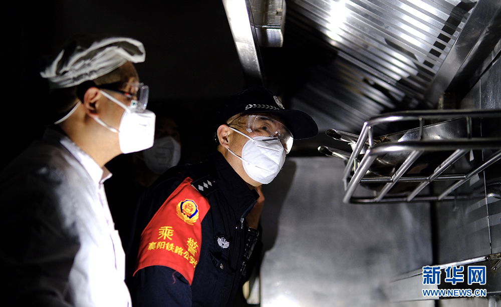 乘警蔣大兵檢查列車(chē)餐車(chē)消防安全情況。新華網(wǎng)發(fā) 賀瑞明攝
