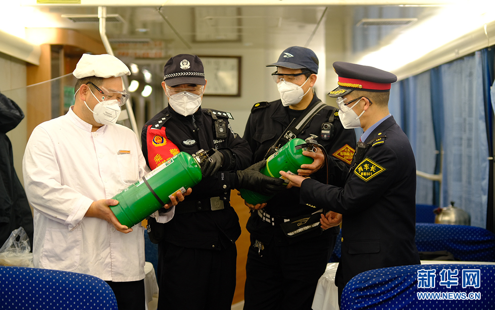 乘警蔣大兵與列車(chē)工作人員檢查消防器材。新華網(wǎng)發(fā) 賀瑞明攝