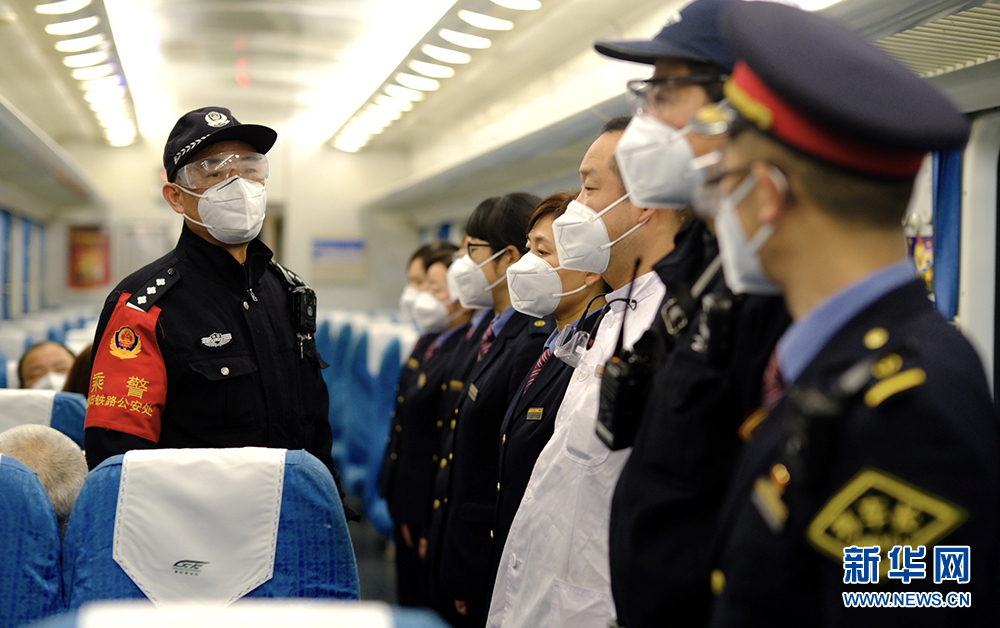 乘警蔣大兵與列車(chē)工作人員商討列車(chē)治安防范等工作。新華網(wǎng)發(fā) 賀瑞明攝