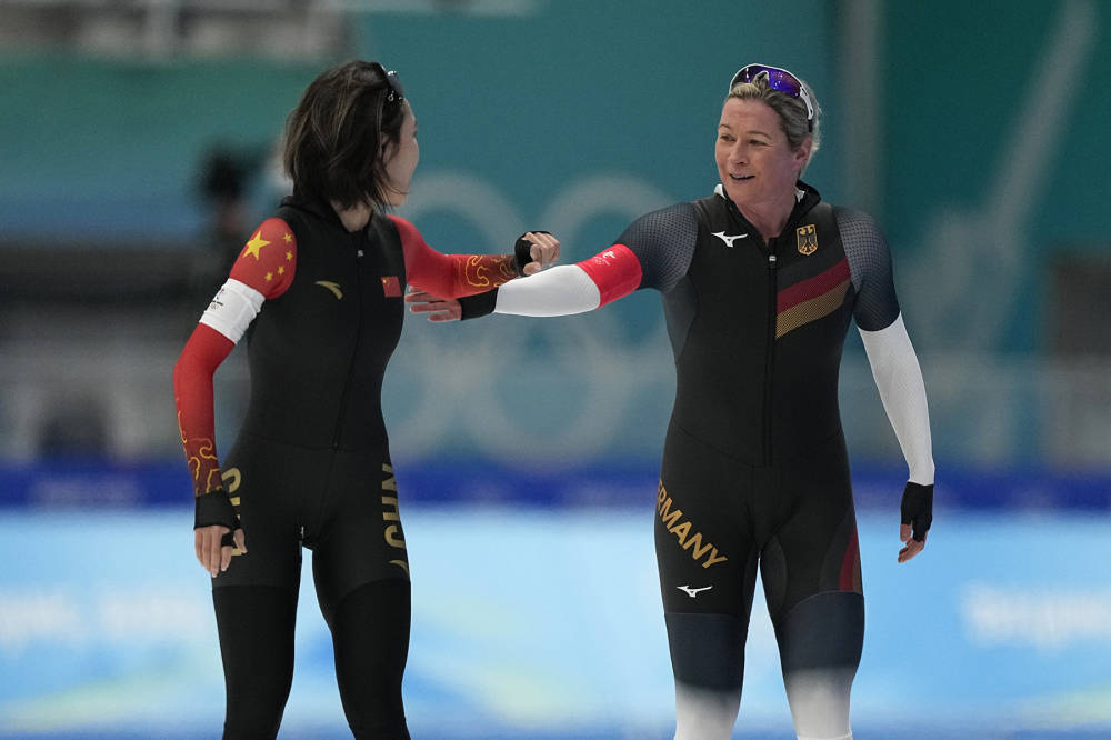 △比賽結(jié)束后,中國選手阿合娜爾向德國老將佩希施泰因表達(dá)敬意,佩希施泰因微笑著鼓勵(lì)阿合娜爾。