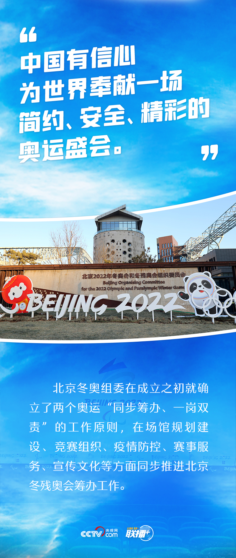 “兩個奧運,同樣精彩”,這是中國的莊嚴承諾。2015年夏天,北京攜手張家口獲得2022年冬奧會和冬殘奧會舉辦權(quán)。此后六年多,北京冬奧組委始終堅持兩個奧運“同步籌辦、一崗雙責”的工作原則,在場館規(guī)劃建設(shè)、競賽組織、疫情防控、賽事服務(wù)、宣傳文化等方面積極推進籌辦工作,努力為廣大運動員提供一流的競賽場地和賽事服務(wù),創(chuàng)造良好的參賽體驗和參賽環(huán)境。