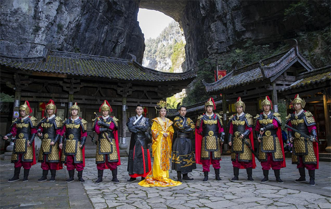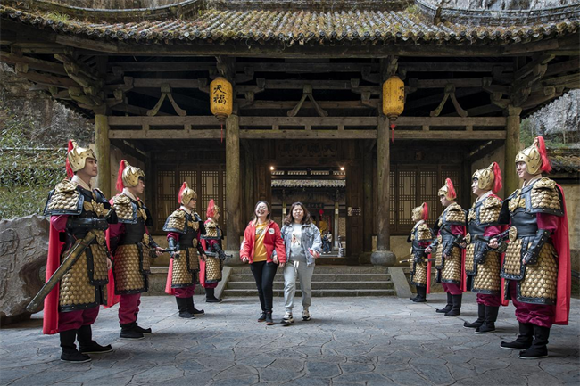 “女王駕到”“恭迎女王陛下”“諸位請起,游玩到此,觀景甚美,諸位與我,共享此景。”在天生三橋景區(qū)天福官驛客棧,一群身形魁梧的帶刀侍衛(wèi),整齊的站在驛站門口兩側(cè)恭迎每位入園的“女王”。現(xiàn)場儀式感爆棚,一身金黃的“女王”霸氣外露。驛站內(nèi)熱鬧的氛圍吸引了眾多游客參與,有的上前與侍衛(wèi)互動拍照,有的主動穿上“女王”服體驗霸氣女王范,有的還主動表演起了電影里女王翻牌的有趣橋段。“今天我最大,這樣過節(jié)著實過癮”玩得正起勁的劉女士表示,這是她過得最好玩、最具儀式感的女王節(jié)。