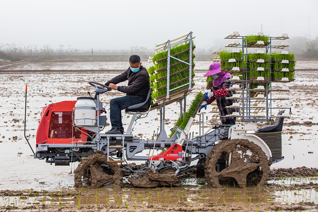 △2022年3月,浙江省溫嶺市一家庭農(nóng)場,農(nóng)民駕駛缽苗擺栽機(jī)進(jìn)行作業(yè)。